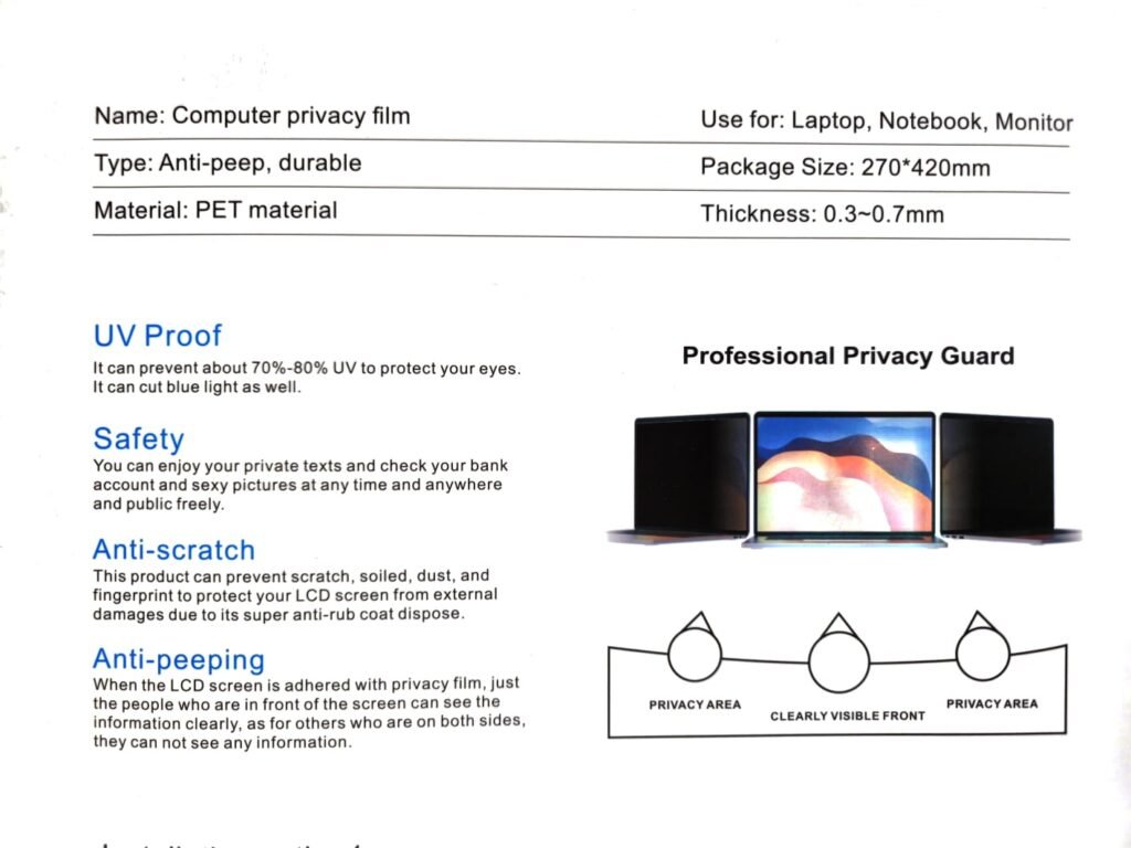 Privacy Protection: Anti-Spy Side View (Blocks visibility beyond ±60°) Viewing Experience: Clear front view, darkened side view Surface Finish: Anti-Glare Matte Finish Transparency: High-Definition Front Clarity