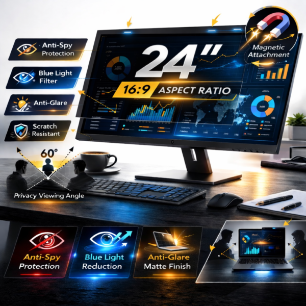 24 Inch Magnetic Computer Privacy Screen Filter | 2in1 – Anti Blue Light Eye Protection with Anti Spy Desktop Security Private Filter | 2H–3H Surface Hardness, Safeguard sensitive information with this 24″ Computer Magnetic Privacy Filter, designed for desktop monitors with a 16:9 aspect ratio.